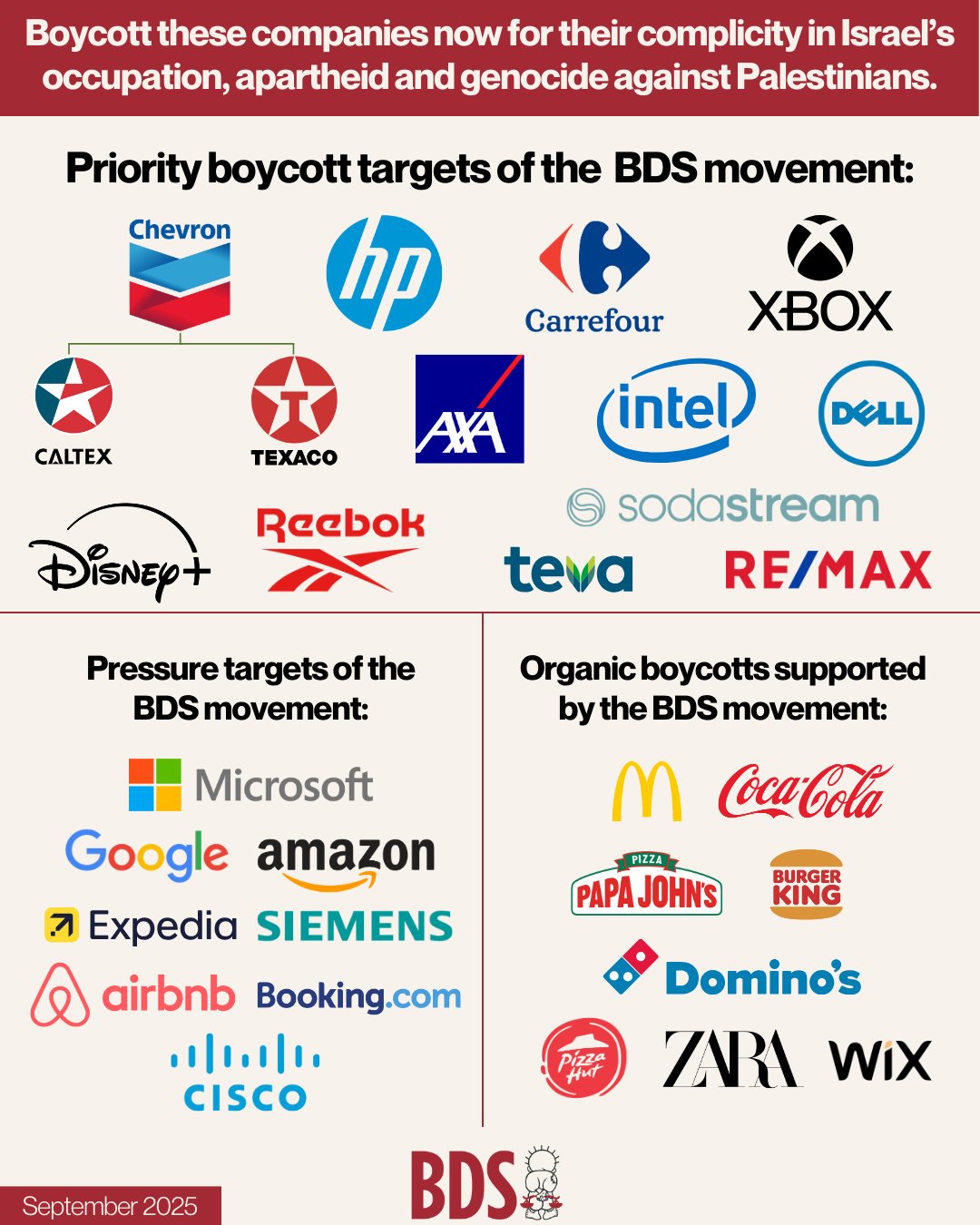 The graphic below offers a BDS list of complicit companies identified by the BDS National Committee for consumers to boycott, including Chevron, Intel, Dell, HP, Disney+ streaming service, Coca-Cola, McDonald’s, and more.